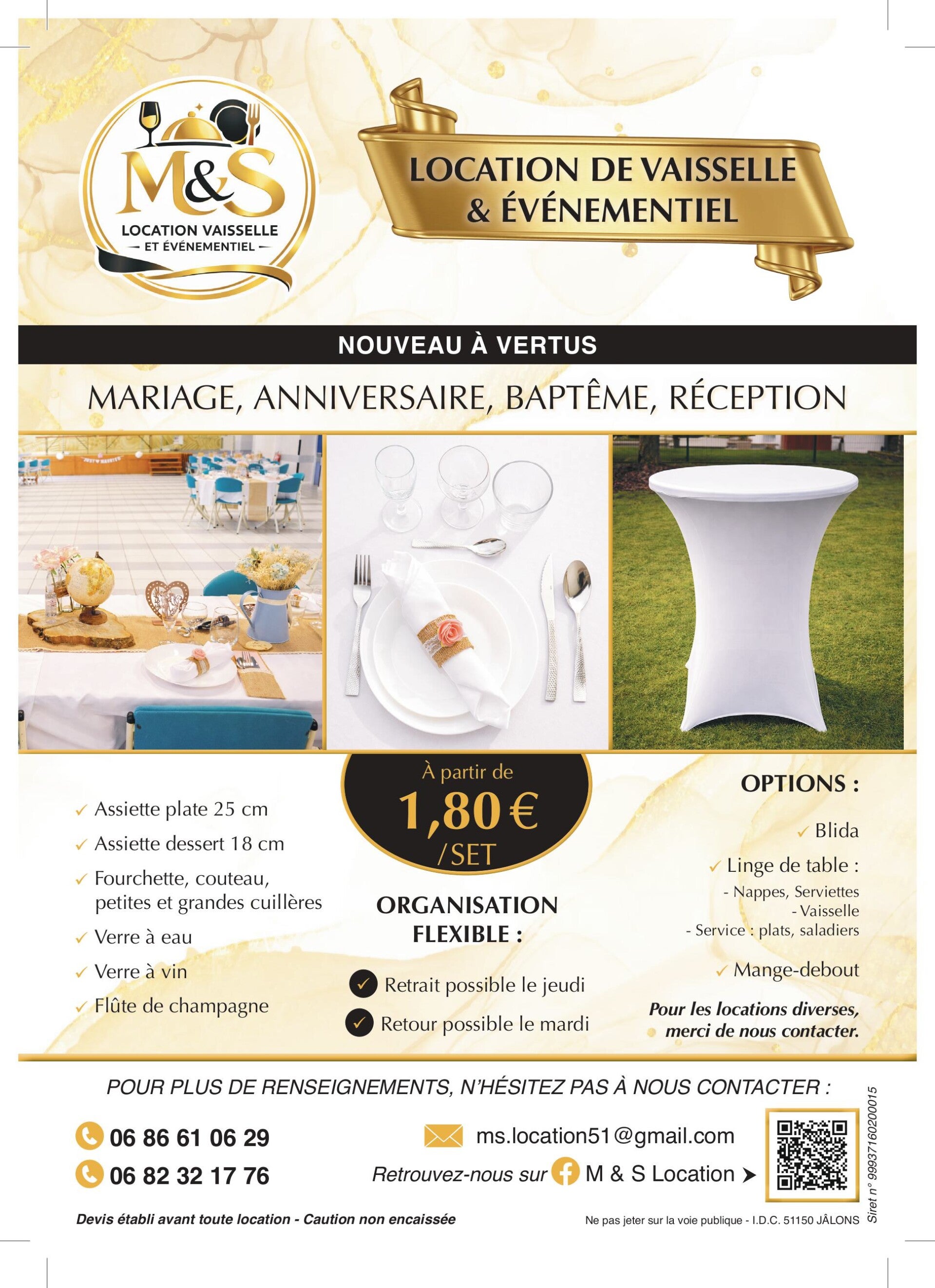 Bienvenue chez M & S LOCATION 51, votre nouveau partenaire local à Vertus Blancs-Coteaux pour la location de vaisselle et matériel événementiel. Née d'une expérience personnelle, notre entreprise met à votre disposition une solution pratique, économique et écologique pour tous vos événements privés et associatifs. Découvrez notre engagement envers la qualité et un service impeccable. Ensemble, faisons de chaque occasion un moment inoubliable.